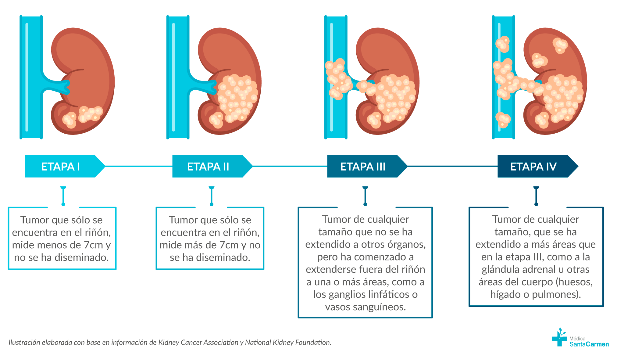 Se le conoce como carcinoma de células renales (CCR) y comienza en los conductos de los riñones –los túbulos renales–. Un tumor benigno no es canceroso, en cambio un tumor maligno sí es canceroso y puede volver a crecer después de extirparlo, invadiendo el tejido cercano u otras partes del cuerpo, como los pulmones, ganglios linfáticos, huesos y cerebro. Cuando esto sucede, se le llama metástasis.